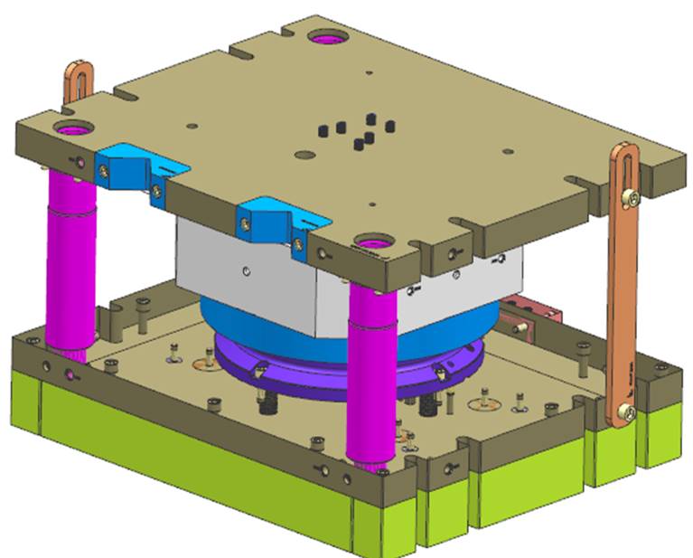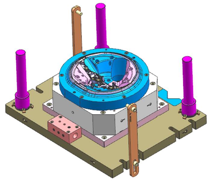 本公司設計的方向盤修飾模具,采用了全包圍式的結構設計,通過下模定位,上模沖剪的結構,實現了方向盤生產過程的穩定和精度要求;其特征主要體現在: